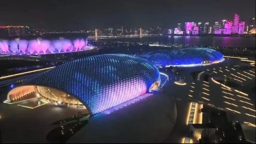 奥体中心主体育馆和游泳馆位于钱塘江南岸,这两座连体建筑采用了独特的流线造型,其设计灵感源自“银河幻影”。傍晚时分,通过LED点光源和灯光控制系统,体育馆和游泳馆的屋顶孔洞中的灯光呈现出银河幻影,就像繁星点点闪耀在星空中一样,将整个场馆变成了钱塘江畔的璀璨夜明珠。体育馆和游泳馆的外围,是勤上提供的大功率照明灯具,绚丽多彩的灯光效果与不远处的“大小莲花”交相辉映,共同组成未来杭州城市地标。